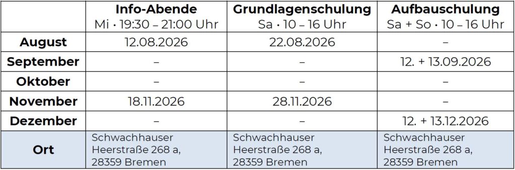 Eine aktuelle Übersicht der Infoabende und Schulungstermine gibt es hier: Termine 2026
